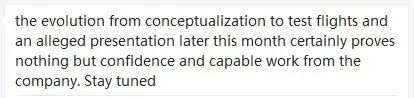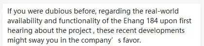 从概念孵化,到测试飞行,再到预计将在月底举行的飞行演示,整个发展过程无比清晰地显示出亿航的信心和能力,待续。