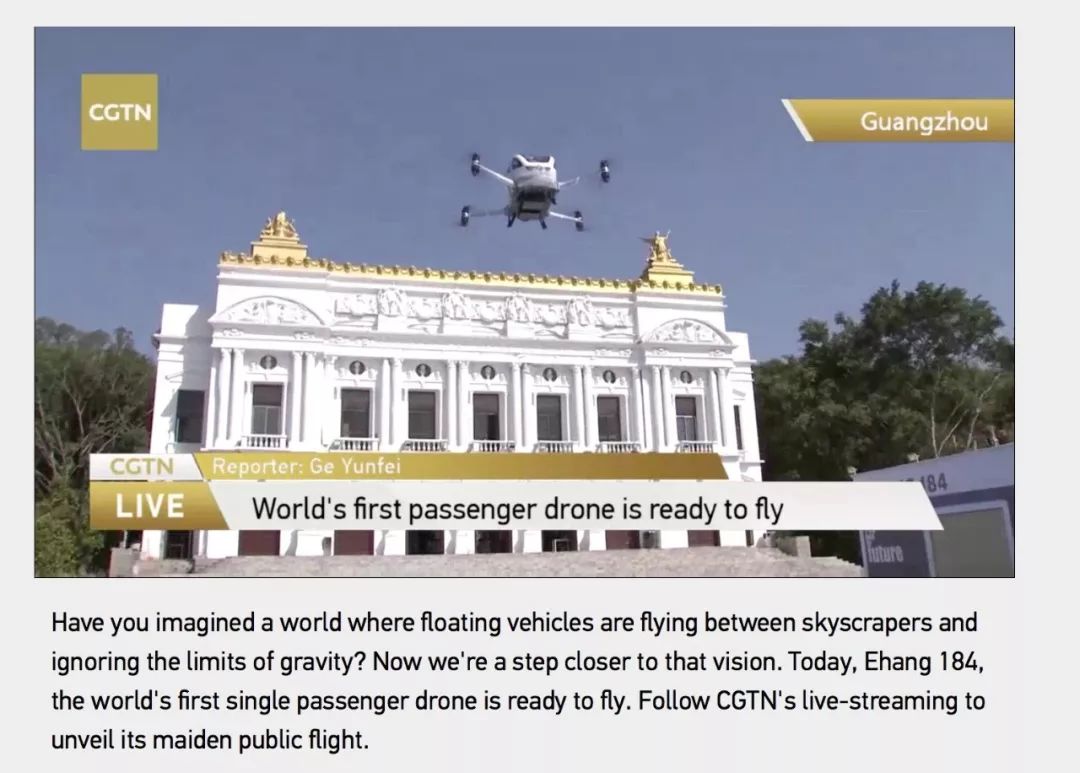 此次EHANG184载人也引来了国外媒体的高度关注,这是再次对外证明着中国创造的实力,从概念到实现,每个媒体都在见证着,其中CGTN央视英文频道在现场进行全球直播,记者上机亲身体验EHANG184,瞬间引来热议,其他国外媒体又会如何看待?