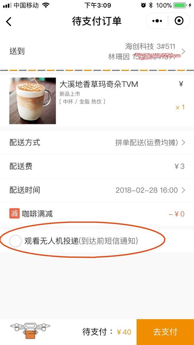 对了,下单的界面还有一个“观看无人机投递”的选项,勾选以后,会在无人机到达前3分钟给你发送短信,然后你就可以赶紧开窗或者跑下楼,围观无人机外卖小哥的身姿!