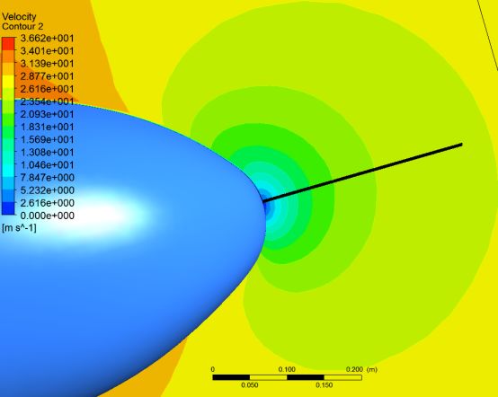 流速云图。本图显示的是机头前方空气的流速,从红色到蓝色流速逐渐减小,机头处颜色最深的地方流速为零。