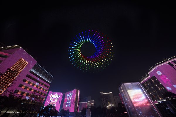 在音乐的变化中,空中的500架飞机又依次组成“国际创新”和“硬科技”这两个极具“西引力”的西安关键词,同时代表高新区前沿科技的机器人和火箭图案轮番闪耀夜空,向现场观众展示西安“硬科技之都”科技创新的独特风采。