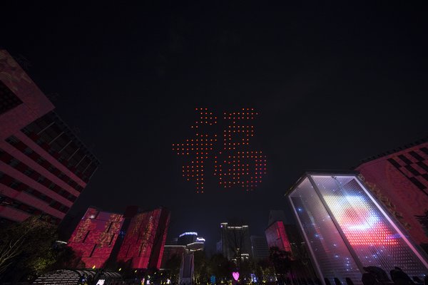 随后迎来“欢乐中国年”篇章,音乐再次变化,在富有中国新年元素的交响乐背景之下,一个巨大的灯笼挂在天穹,由无人机形成的“元宵”、“福”字、“2018”、“西安年”等新春元素轮番登场,把元宵佳节灯光大秀的喜庆气氛推向高潮。