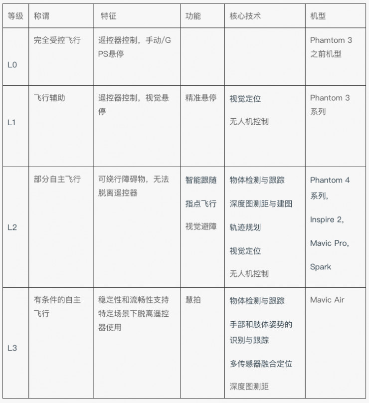 在表格中可以看到,启动了慧拍功能的Mavic Air,在诸多核心技术加持下,已经能够达到L3的自主飞行。它在特定的场景下脱离遥控器使用,可类比于在L3的自动驾驶中允许司机的双手离开方向盘。