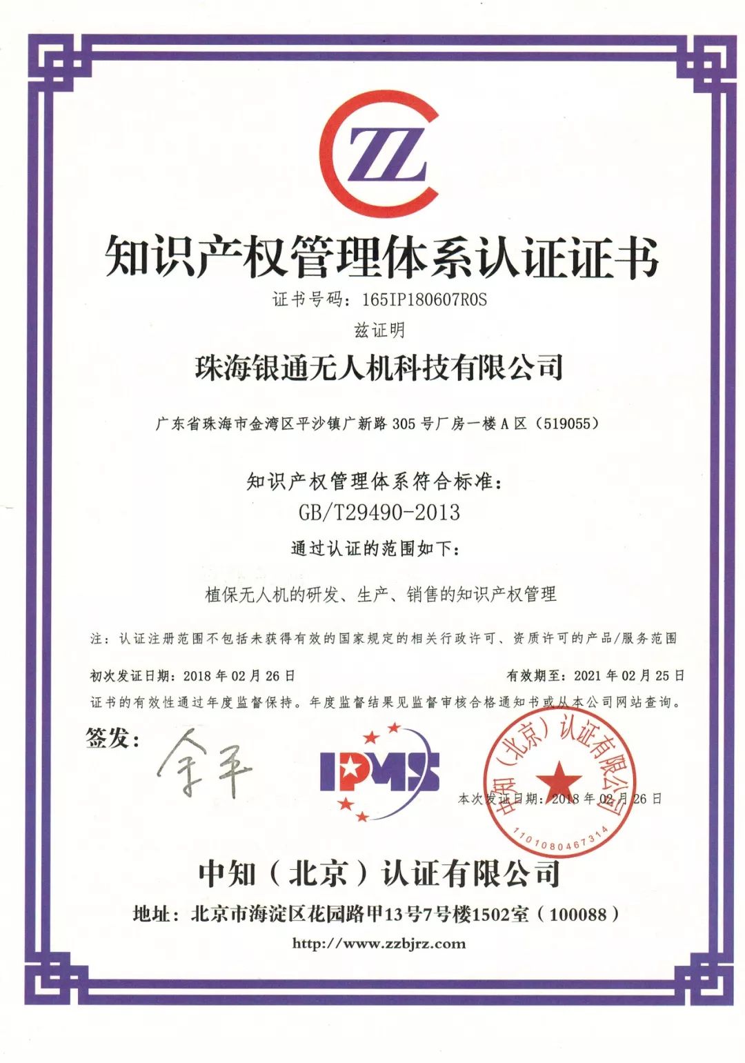 近日,银通无人机正式取得由中知(北京)认证有限公司颁发的“知识产权管理体系认证证书”。也标志着我司在知识产权工作又迈上了新的台阶。