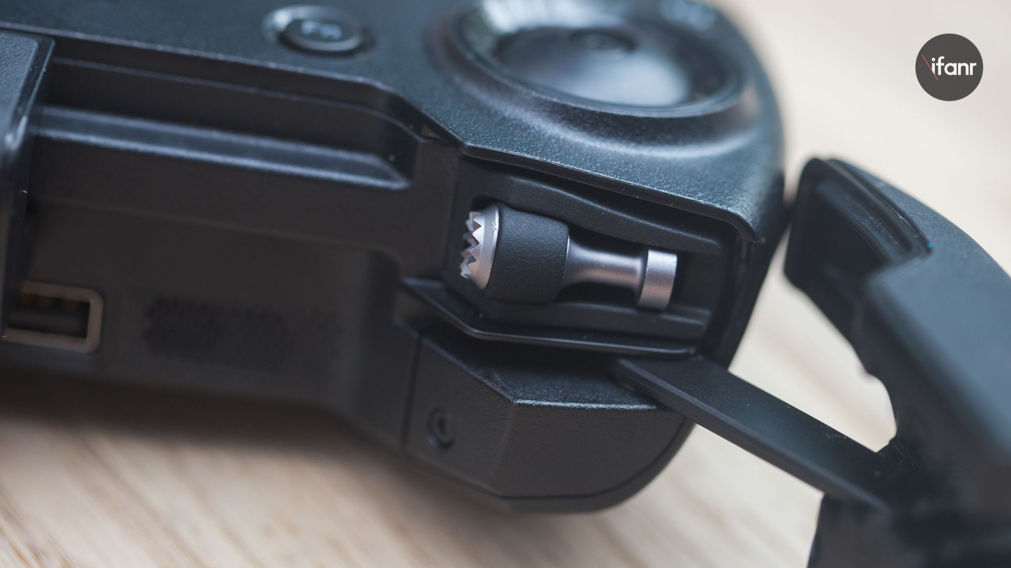 Mavic Air 的遥控器和 Spark 的遥控器几乎一样,目测这个经典设计会延续很多年。可拆卸摇杆结构简单,体验出色。只要像拧螺丝一样把摇杆拧下来,藏在手柄两侧的空隙,就能把遥控器四平八稳地装进口袋里,不用再担心会不会把摇杆折断,注意别在拆摇杆的时候手滑弄丢就行。