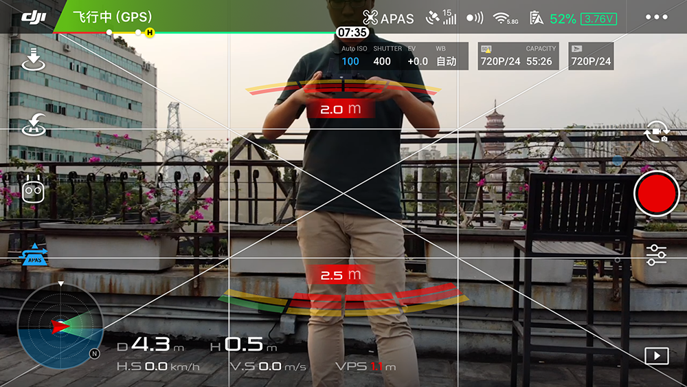 首次登场的新概念 APAS 引人瞩目,大疆把很多无人机厂商想做但做不了的功能下放到了中端航拍无人机上。现在,我完全敢推满杆让 Mavic Air 径直向我飞过来,打开了 APAS 的 Mavic Air 会很自然地从我的头顶或是身边自动绕行,即使 APAS 失效,避障系统也可以保底避免 Mavic Air 撞到我身上。