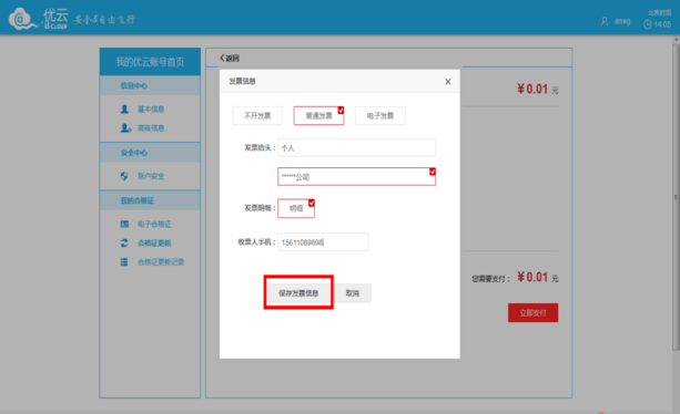 5. 在“发票信息”页面。可选择“不开发票”、“普通发票”、“电子发票”三种开票方式。如选择“普通发票”、“电子发票”,则必须填写“发票抬头”、“收票人手机”。单击“保存发票信息”按钮,返回到“合格证更新考试费用”页面。