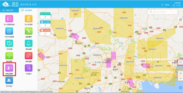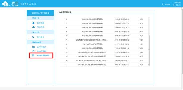1. 在优云系统主界面中,单击用户名。在弹出的列表框中,单击“我的优云”。如下图所示。在“我的优云”管理页面,单击“合格证更新”按钮,进入“合格证更新”页面。