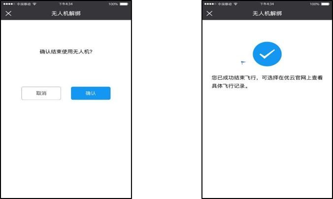 注:飞行实施完成后,如不点击结束使用,将不能正确记录本人有效单飞时间,且会影响后续该训练无人机时间记录准确性