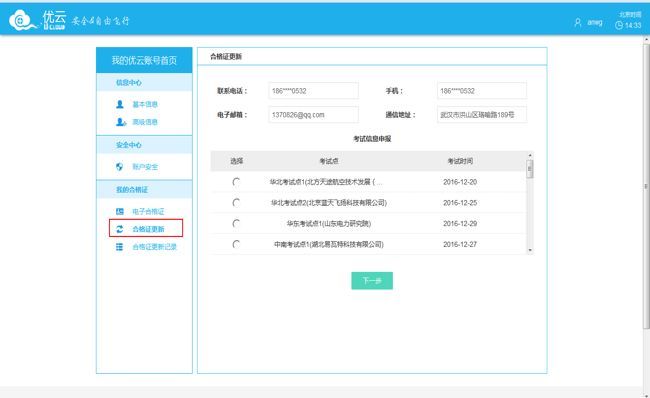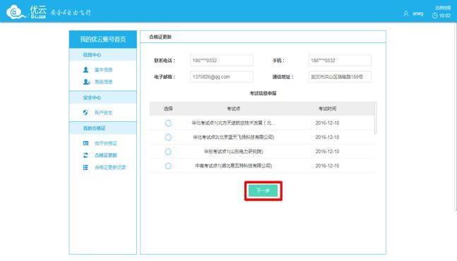 3. 在“合格证更新”页面,用户可核对联系电话、手机、电子邮箱、通信地址等信息,并选择考试点。如果信息不对,可修改正确。确认合格证信息正确无误后,单击“下一步”按钮,进入 “合格证更新考试费用”页面。