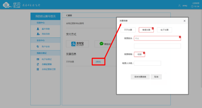 4. 在“合格证更新考试费用”页面。选择对应的支付方式,并选择填写发票信息。其中发票信息为默认不开发票,如果需要可单击“修改”进入“发票信息”页面填写开票信息。