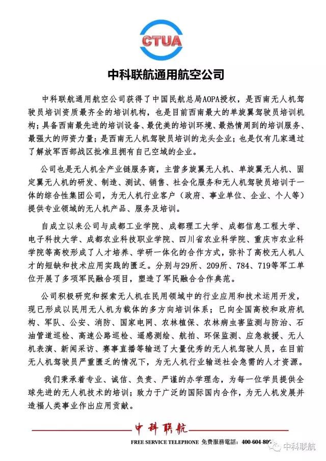 我们秉承着专业、诚信、负责、严谨的理念,为每一位学员提供全球先进的无人机技术的培训;致力于广泛的国际国内合作,为无人机发展并造福人类事业作出应用贡献。