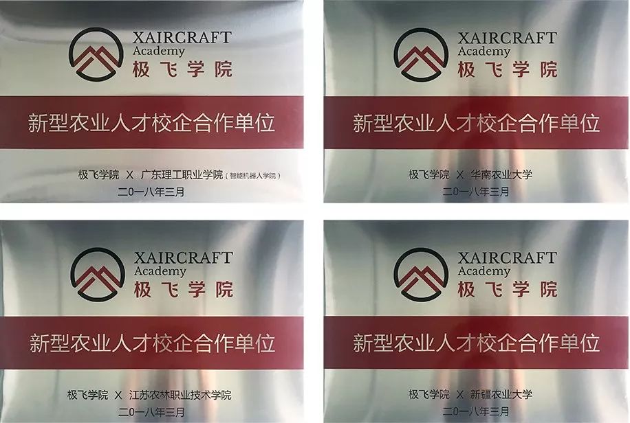 2018年3月份,极飞学院与华南农业大学、新疆农业大学、广东理工职业学院、江苏农林职业技术学院等多所学院相继达成合作意向,标着极飞科技与全国各地高等院校的合作计划正式启动。