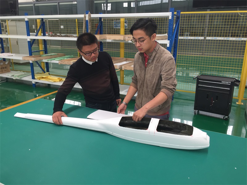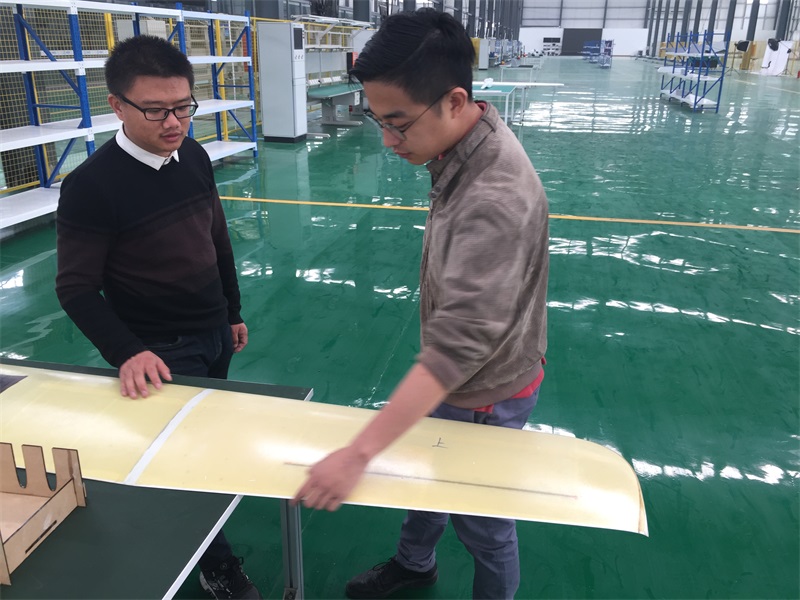 在简单介绍完机型的特点之后,周总便带着我们参观了工厂,一开始我们进入的就是该公司的零部件区域。在这里,我们看到电池和飞控、云台等零部件整齐的摆放,周总说这里就是让工程师们进行零部件与无人机的搭载测试的地方。每一个零部件都不能马虎,要准却的测试出他们的特性和使用情况。转眼间我们又来到了他们制造符合材料的外面,看到一些原材料进行着特殊的工艺,进而制作出新的复合材料,这种材料的重量比其他市面上其他同机型上面使用的材料更轻更坚固,再一次感叹他们的工艺。之后我们又来到了他们进行机身定型的车间,在做好的新材料上面直接开出两片机翼。最后,周总还跟说道一些周视经纬用在机翼上的小设计,从而大大减少了飞机在空中降落时候的阻力,而往往受欢迎的产品总是因为一些不起眼的小设计而成为经典的。