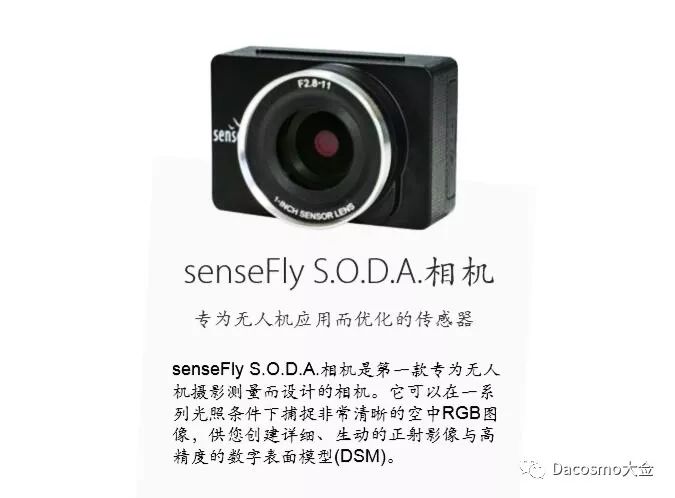 senseFly S.O.D.A相机是senseFly第一款专为无人机摄影测量工作而研发的照相机。这个1英寸, 2000万像素的 RGB 相机可在各种光环境下捕捉超清的空中图像, 帮助senseFly 固定翼无人机操作员生成详细、生动的正射影像与超精确的3D 数字表面模型。senseFly S.O.D.A相机与大多数 senseFly 固定翼无人机兼容, 包括飞行覆盖面积广的eBee Plus。
