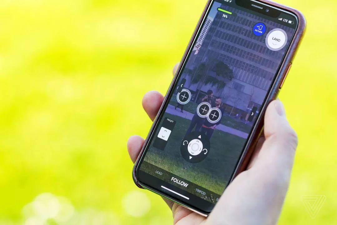 一旦飞机起飞后,你就可以从 Skydio 的应用上手动控制 R1 了,你可以用屏幕上的高度和方向按钮来控制飞机。你也可以选择点击镜头画面中系统在你脸上或者是别人脸上标记的圆圈,让 Skydio R1 在视线中自动识别你。