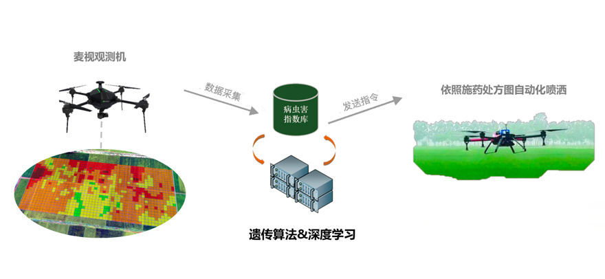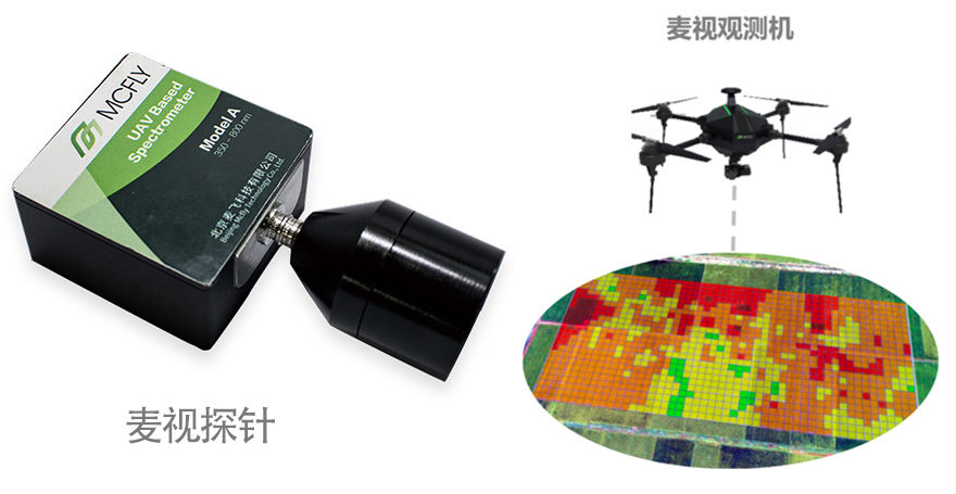 针对低空农业遥感的需求,麦飞科技自主研发了一款无人机载荷叫“麦视探针”,波谱范围320—1220nm,集成了团队的AI软件算法,建立起了光谱与农作物病态之间的关系,从而实现病理药理建模是其关键技术所在。搭载麦飞探针的无人机在农田上空飞一遍,就可以得到当前农田的病虫害状况光谱图数据,数据上传到麦飞AI云进行分析计算,最后输出配药施药方案,一般5分钟之内就能得出结果,再传输给植保无人机喷洒农药即可。施药后,麦飞监测机可持续抽样监测,跟踪病虫害防控效果。