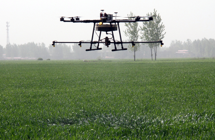 在操作人员的操纵下,无人机螺旋桨开始快速旋转,随后缓缓上升,伴随着嗡嗡的轰鸣,无人机开始作业,喷出的浓浓药雾均匀地洒在小麦上。仅4个多小时,1000多亩小麦喷洒完毕。