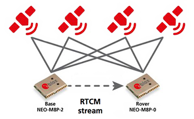该技术被称为实时运动学(RTK),并由无线电技术委员会海事服务组织(RTCM)定义的国际公认标准涵盖。它依赖于基站和流动站之间的实时通信信道,最常用于高端测量设备。然而,这项技术已经开始在定位为大众市场解决方案的模块中提供。一个例子是来自u-blox的GNSS定位模块,包括NEO-M8P-0和NEO-M8P-2模块,分别为流动站和基站设计。