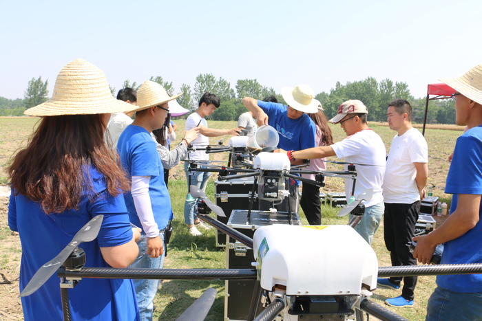 5月底,阜阳的天气格外晴朗,炎炎烈日,骄阳似火,但各位农场主的学习热情却分外高涨。各学员五人为一组,在公司培训师的讲解下,现场观摩了解了植保无人机的构造,并按照步骤拆装无人机,熟悉飞机及遥控器各部件的功能和使用方法。