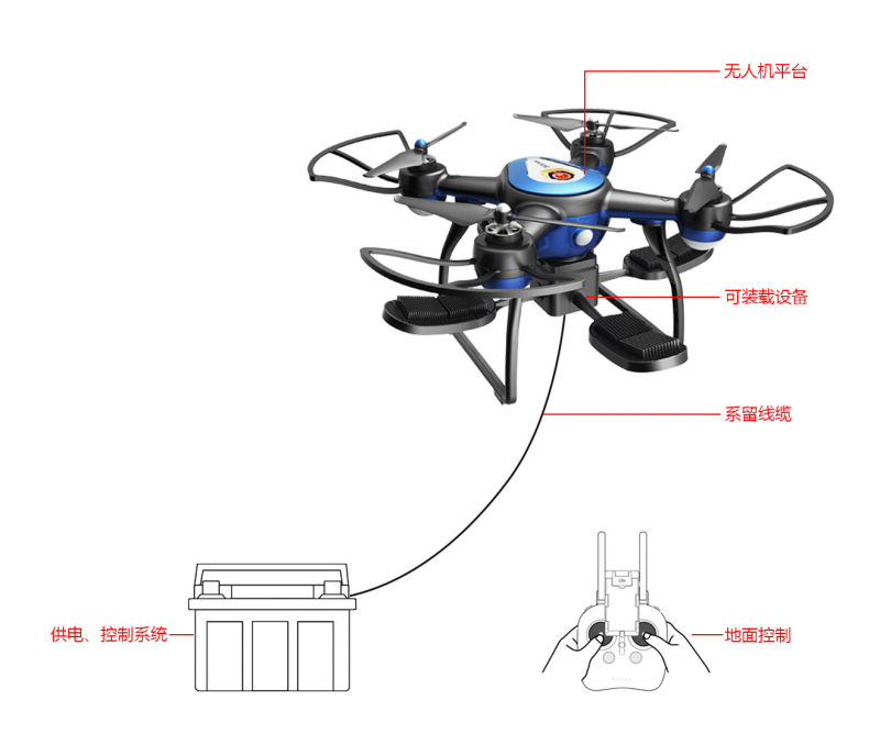 该系留悬停灯提供600瓦的LED灯,能较好地解决目前公安、消防、电力、农林、公路、桥梁、建筑等部门在复杂环境下应急救援、群体性事件处置、晚间作业、施工等的难点。经实践检验,功能强大,效果明显,可以不受电能限制而长时间停留在空中,应用于长时间不间断的空中监控和应急通讯、救援照明等。解决了普通无人机平台续航时间有限,国外系留无人机滞空系统体积大,携带不便、掉落安全隐患大等缺点。