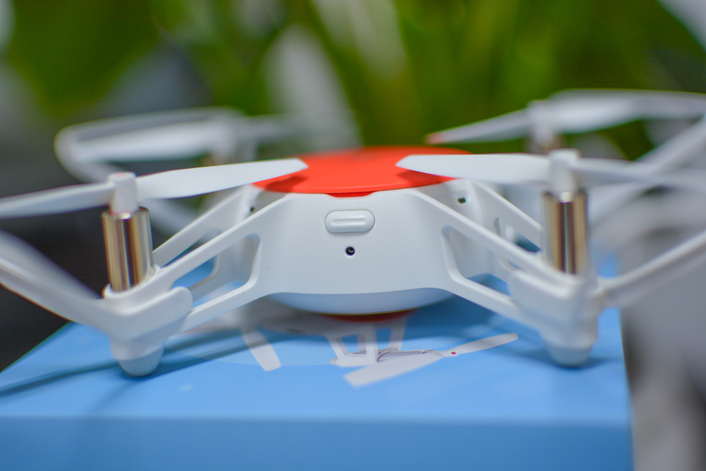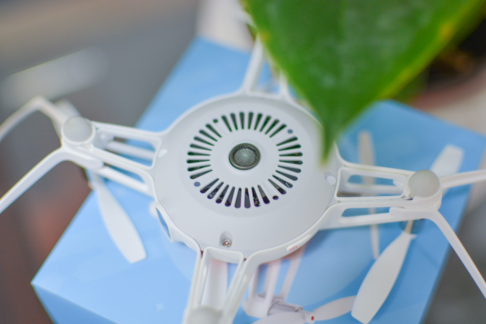 机身底座,中心部分为超声波探测器,能够有效探测其下部物体,有效躲避障碍物。同时,底座部分包含两个指示灯,分别为橙色和蓝色,橙色指示灯用来指示小飞机是否开机,而蓝色指示灯为充电指示灯。