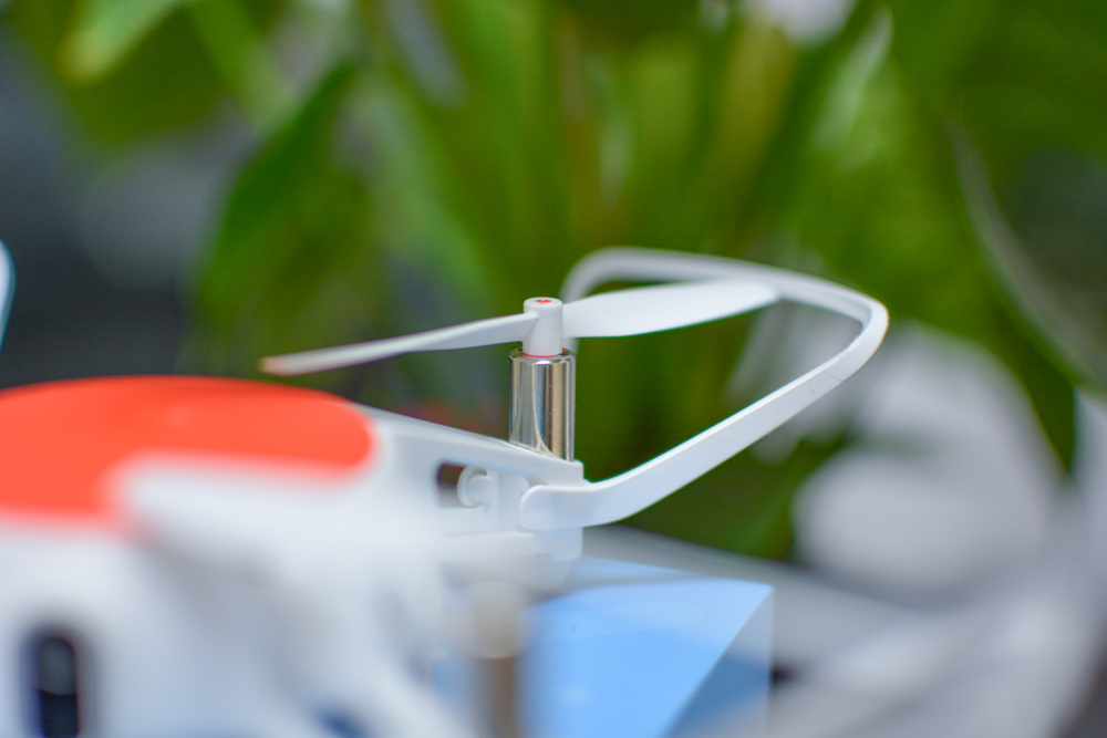 上图所示为小飞机螺旋桨部分,其螺旋桨部分采用塑料材质,螺旋桨转轴处采用金属材质,从之后的实际体验上来看,四个螺旋桨支撑机身88g的重量是完全没有问题的。