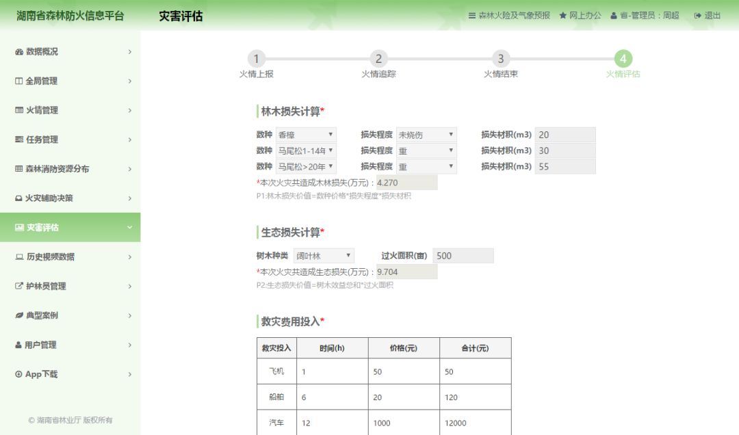 此外在灾情结束后,指挥中心根据森林消防人员传输回来的树木种类、过火面积、材积损失等数据,会在系统内自动生成数学模型,直接算出林木损失、生态损失、经费投入等因灾损失数据,进行灾情评估。