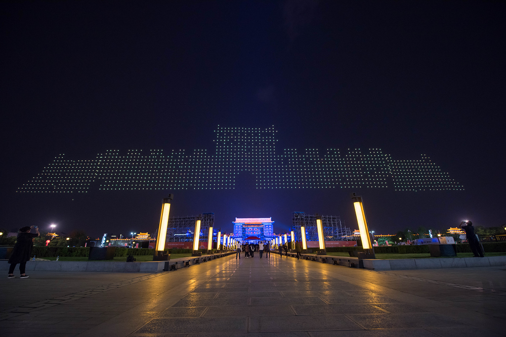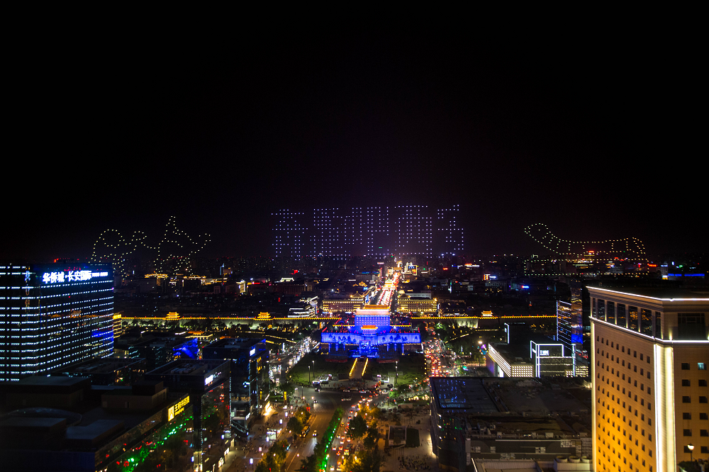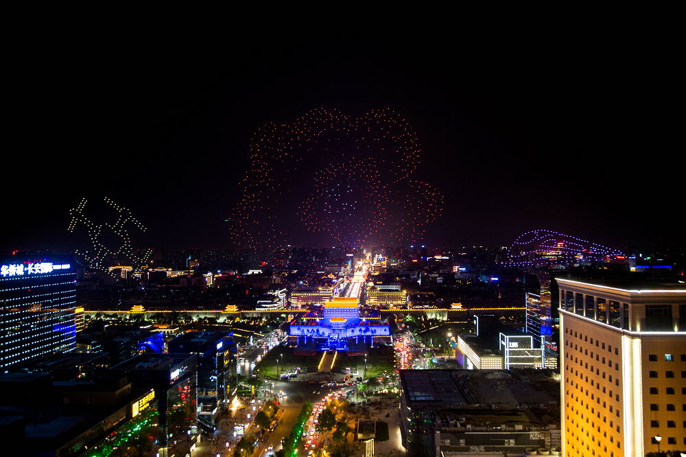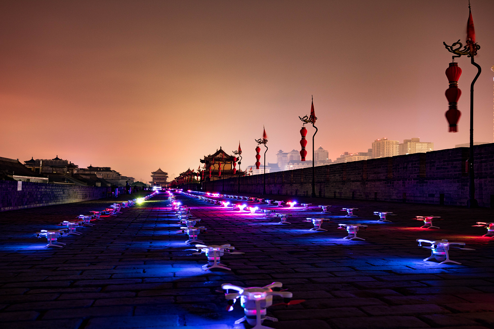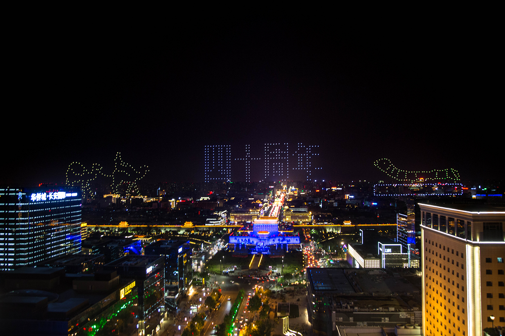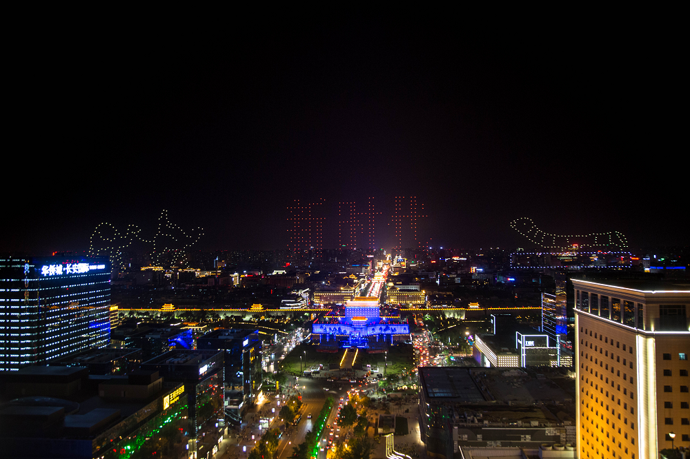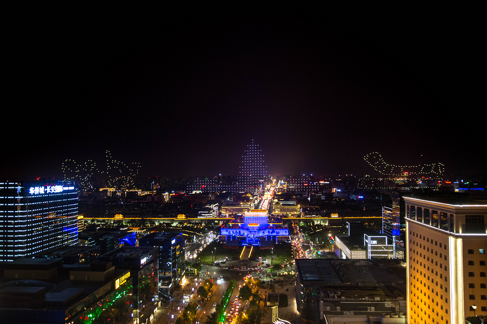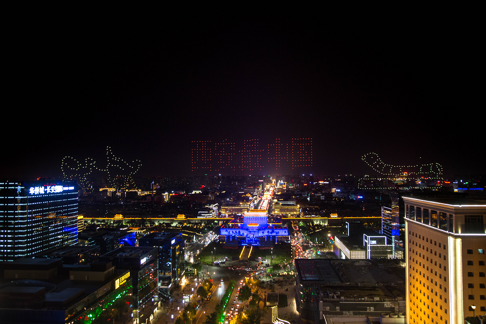 集光影科技、现代艺术、古城文化为特色的无人机光影秀,开创了科技+艺术+文化完美融合的新模式,成为西安城市的新名片,白天空中看古城,夜晚古城望星空,别具创意的无人机高科技表演,给中外旅游者多了一个来西安的理由,也向全世界展示出“中国智造”的硬科技魅力。
