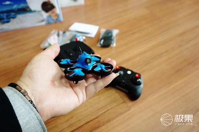 Shark穿越机个头是真的小,放在掌心对比,还没一个手掌大。机身尺寸,83.5*83.5*45.6MM,中间是一个鲨鱼造型外壳,带有FPV系统,广角摄像头,四周30mm螺旋桨,图传天线等等。应该说是见过的无人机里最小的一款,也是MINI无人机里配置最齐的一款了。