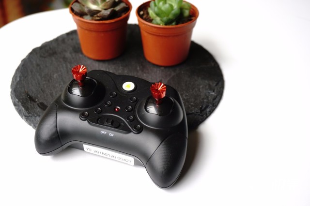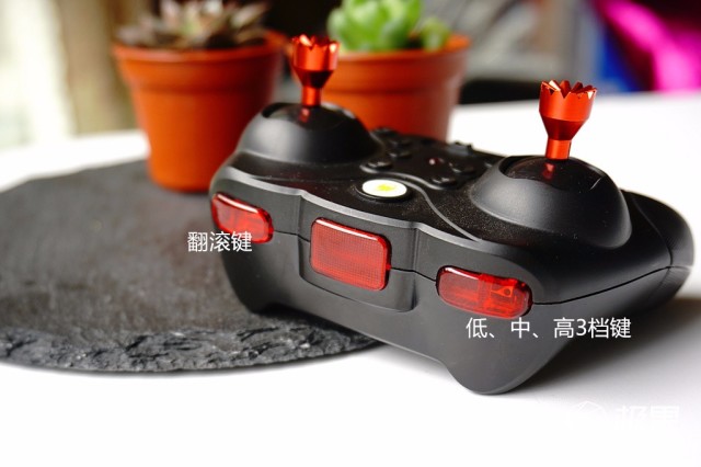 遥控器的控制模式,如果按照专业无人机的遥控对比,Shark穿越机应该属于“美国手”,就是左摇杆负责上身/下降和机头左右旋转,右摇杆负责前后左右移动。而且还在遥控器中加入了一键返航、一键起降和无头模式,对于初学者来说,是非常的重要,也极大的提升了无人机的操控性。另外,类似游戏手柄,除了大拇指操控,前面左右两个还可以通过食指调速和翻滚。