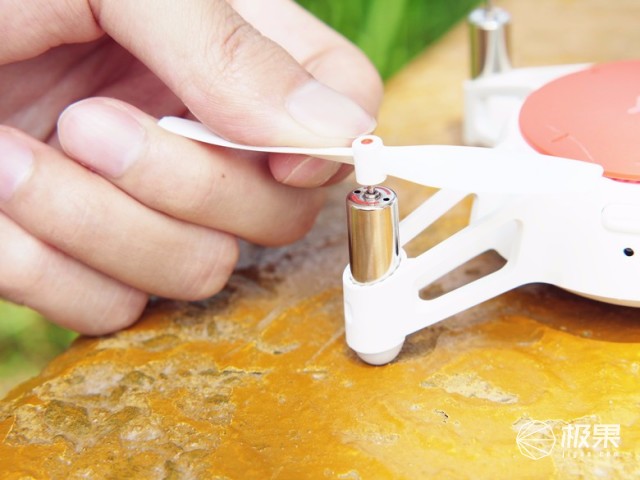 在安装螺旋桨的时候需要特别注意,需要区分正桨和反浆,正桨在桨叶和电机部位特别标记了橙色,对应位置按紧即可。支架的安装则非常简单,需要注意的是凹凸槽一定记得锁紧。