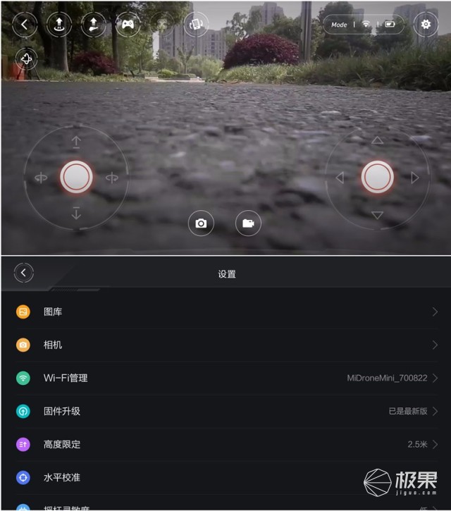 小飞机的操作界面还是非常容易上手的,左手摇杆可以控制上升下降,顺逆时针旋转,右手摇杆可以控制前进后退,向左向右,上部一排按键有起飞/降落、掌上起飞、红外对战、重力感应、无头模式和四向翻滚。在设置页面里还可以看到限定高度设置、图库等。