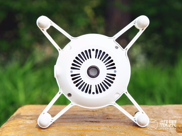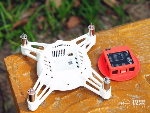 机身的侧面还有小飞机的电源按键、电池解锁键和充电、数据传输Mirco USB接口,而飞机虽小,但是在机身底部可以看到超声波探头、光流相机和蓝色、橙色指示灯以及第二处红外接收器,在机身内部还配备了 4 核 1.2G SOC 主控芯片,能迅速处理由超声波、气压计、光流传感器等多传感器群组收集的数据,实现精准的定高、定点悬停。