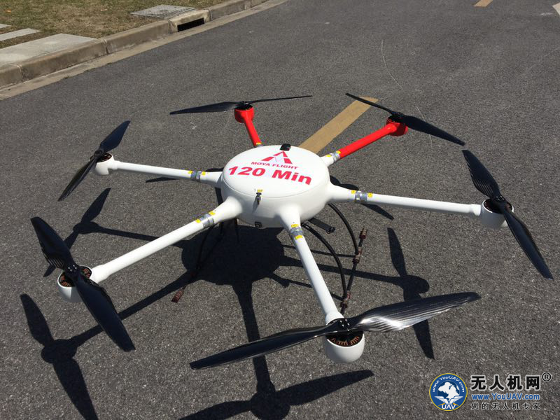 MF-J6为墨扬智能首款纯电动六旋翼飞行器,最大起飞重量为24.5kg,最大续航时间为120分钟,可适用于低温高海拔等环境。这款飞行平台经其测试在负载3kg的情况下可持续飞行60分钟以上。