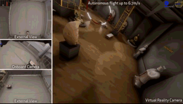 无人机大概能以90帧的速度处理虚拟图像,比人眼能处理的图像速度快三倍。这个由尼龙和碳纤维3D打印而成的无人机框架中装备有惯性测量单元和相机(VIO),以及一个嵌入式计算机。