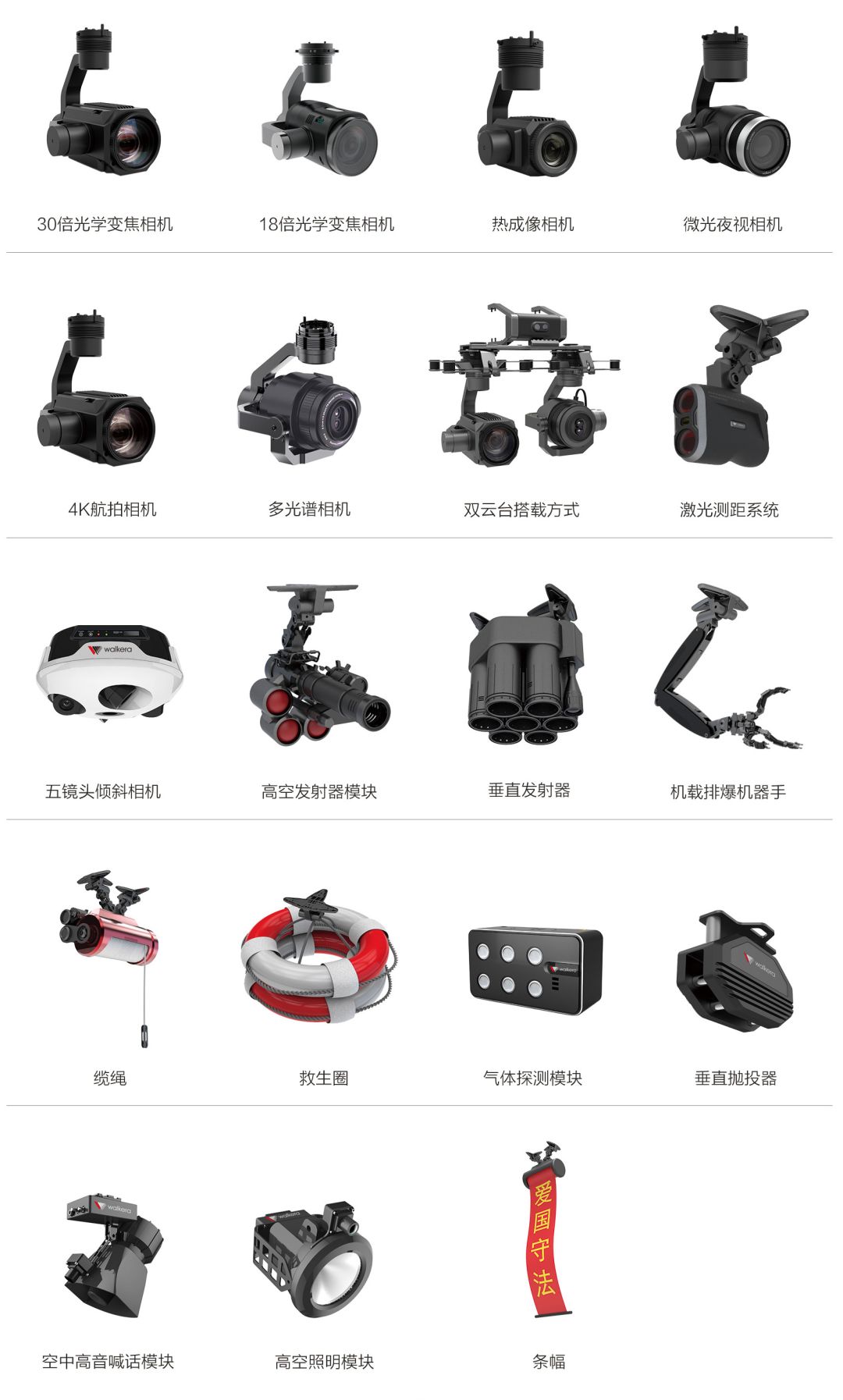 FE15消防察打一体无人机飞行平台的任务模块采用统一接口设计,可适配多种任务模块。 根据需求更换相机或其他任务设备,使之成为跨界无人机。在其他领域也能起到非凡的作用,目前华科尔已研发制造出众多实战应用模块。如:30倍光学变焦相机、红外热成像相机、多光谱相机、微光夜视相机、信号发射台、救援设备等,根据不同的使用环境灵活挂载不同的设备。