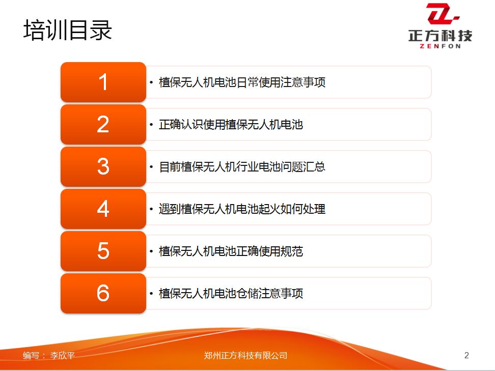 正方科技经过数月调查与一线走访,在用户培训、产品售后、使用规范等经过整合,编写这份植保无人机电池培训教材,希望植保人可以安心飞防,售后培训逐步规范。始终坚持以科技创新服务于三农,打造中国智能供电系统行业第一品牌,希望在每一个植保时节,都有正方科技(ZENFON)极兆供电系统为您做后盾支持!