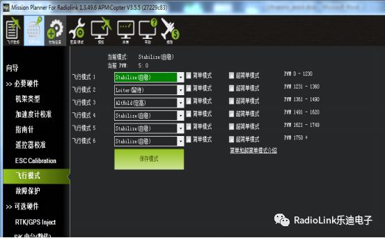 在Pixhawk配置完成并且超声波避障定高模块数据正常输出后,需要设置必要的飞行模式,最基本的模式为1:Stabilize(自稳) 2:AltHold(定高) 3:Loiter(悬停),如图所示