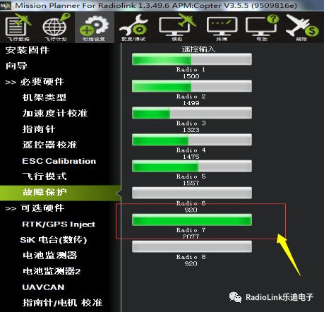 选择一个二挡开关作为控制7通道的开关,在地面站的初始设置界面下的必要硬件的下拉列表中,左击故障保护,打开即可显示7通道的PWM值的界面,当拨动该开关时,7通道的PWM值大于1800,代表开关拨动到该位置时,避障功能打开,拨动到另一个方向是,避障功能关闭。如下图所示