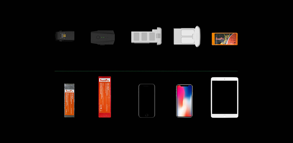 DP 45K不仅仅支持普通2s-4s无人机电池,普通航模电池,大疆精灵3精灵4系列,御系列和晓系列电池的充电,还能兼容市面上百分之99的数码设备。可以说几乎任何带有usb接口的数码设备都可以用它来充电。