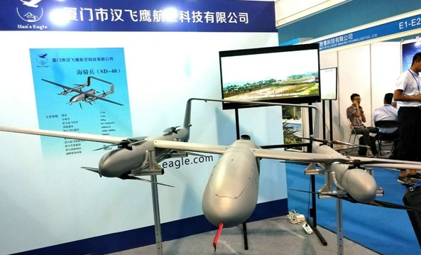 汉飞鹰航空携40公斤级复合翼无人机海骑兵(SD-40)亮相展会。SD-40采用“固定翼+多旋翼”的复合翼构型。起降阶段采用四轴8桨多旋翼提供升力和控制力,转入平飞后多旋翼停转进入固定翼工作模式,集合了多旋翼垂直起降和固定翼大载荷长航时的优点。悬停动力采用余度设计,异轴2个电机故障情况下依然可以安全飞行。