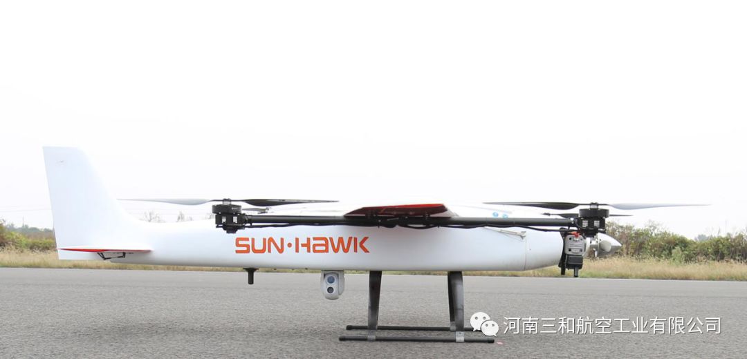 “天眼”垂直起降无人机系统是三和航空工业有限公司自主研发的中型工业级无人机,采用固定翼结合四旋翼的复合翼布局形式,将旋翼完美融合到固定翼系统,改变了传统固定翼无人机起飞模式。突破性解决固定翼受飞行跑道、环境、需专业技术人员操作的条件限制,实现了固定翼无人机依靠电机作垂直起降、汽油发动机作长航时巡航飞行的两者功能相结合,使无人机不受起降环境影响,具备飞行速度快、抗风能力强和长距离执行任务的特点。