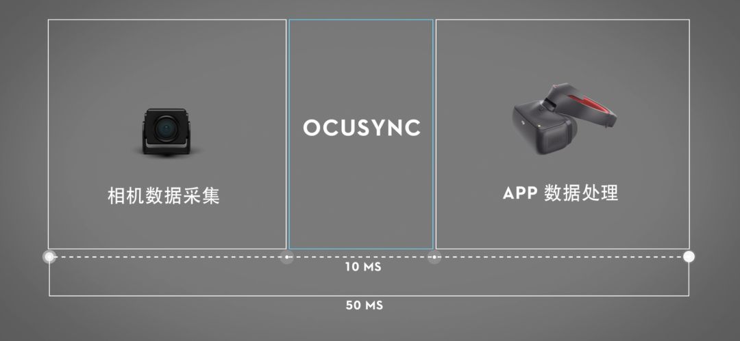 此外 OcuSync 无线传输部分的时延小于 10ms,并深度优化相机镜头采集到 APP 设备显示信号传输,使用 Ocusync相机模块搭配DJI 飞行眼镜 竞速版时,综合延迟可低至 50ms。