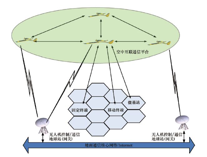 无人机控制/通信地球站通过与无人机之间的双向通信,实现对无人机的控制,以及无人机覆盖区域用户信息与地面通信网络之间的无缝接入。无人机控制/通信地球站具备同时接入和控制多架无人机的能力。多架无人机直接或间接实现相互连通,构建空中互联网络,无法直接接入控制/通信地球站的无人机可经由其他无人机中继间接接入地球站。微基站主要用于手机、笔记本电脑等较微弱信号用户与无人机通信的中继,通过一个或多个微基站实现对一个蜂窝小区的覆盖,实现该小区中用户的无线通信接入功能。固定终端或移动(车载)终端主要是针对一些特定无微基站覆盖的应用场景,用户通过在家中或车上安装一个专门的信号增强转发器,经由转发器的中继实现用户的无线通信接入。