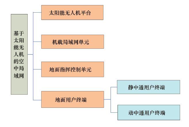 基于太阳能无人机的空中局域网由太阳能无人机平台、机载局域网单元、地面指挥控制单元和地面用户终端组成(图3)。其中地面用户终端根据用户类型分为静中通和动中通用户终端。