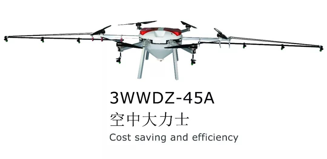 3WWDZ-45A是一款多功能农用无人机,最大作业载荷45kg药剂或颗粒粉剂。以六旋翼电动无人机为飞行平台,通过快速更换不同功能的挂载设备实现多种作业需求,如植保喷雾、辅助授粉、田间运输、农作物勘察、肥料播撒、种子播撒等。根据不同作物,还可自行调节喷洒流量,飞行速度,高度等。作业喷杆与整体支撑结构融为一体,喷头置于旋翼的下方,工作中螺旋桨的下洗气流可以很好的增加喷施药剂的穿透性,同时促使农作物摆动,叶片的正反面均可着药,提高施药效果。