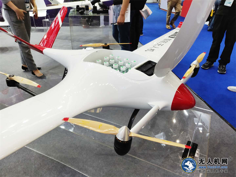 智航V380无人机采用的是公司成熟的倾转旋翼技术,该机同样是具备垂直起降的功能。V380设计特点在于其机身与机翼融合一体,不仅可以提升飞机的续航能力而且还提升了载物舱的容积。前端为该机的载物舱,大约有15L的容积,足以容纳20瓶550ml的矿泉水。智航V380无论是容积还是其载荷能力较智航第一款V330相比都有很大的提升,更加适合一些应急品的快速运输,是一款专门为快速物流而打造的一款亮点产品。