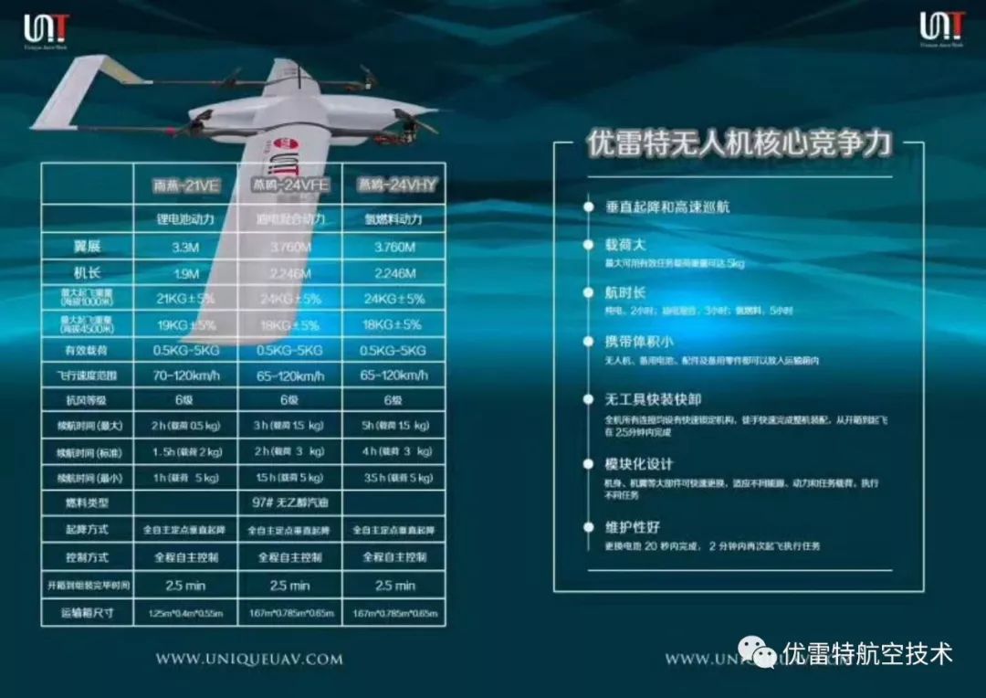 优雷特雨燕 VTOL330-21VE 和 雨燕 VTOL330-21VFE两种无人机最大外形尺寸相同,只需要更换不同的机身和尾撑即可实现转换。该无人机同时具备四旋翼飞行器垂直起降能力和固定翼飞行器快速巡航的能力,具备广阔的应用前景。