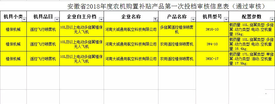 2018年5月22日安徽省农机局皖农机计财〔2018〕52号文件下发关于开展2018年度农机购置补贴产品第一次企业自主投档申报工作的通知,河南大诚通用航空科技有限公司按照要求申报了三款机型,三款机型均成功进入了安徽省国补目录!